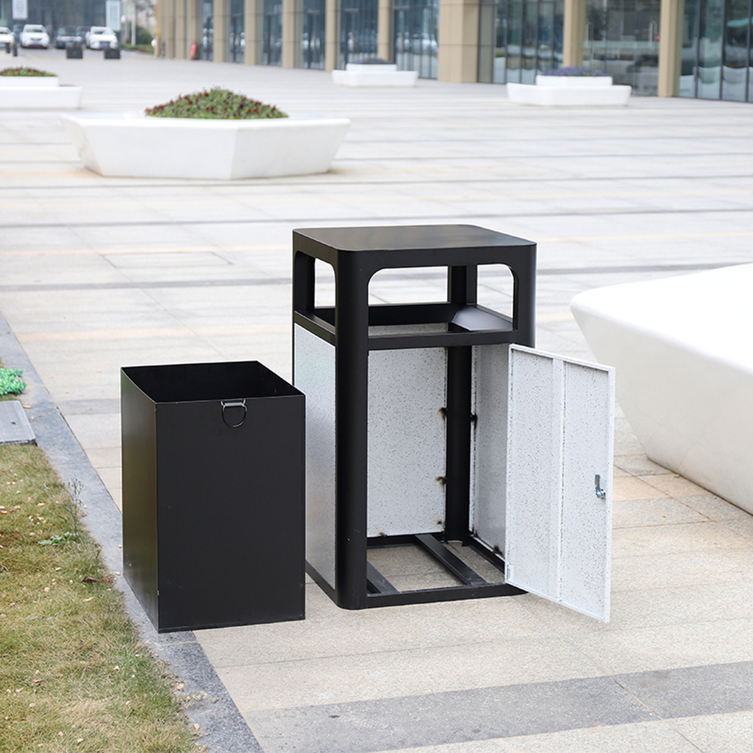 Un coș de gunoi exterior premium, conceput pentru durabilitate extremă și prezență vizuală elegantă. Fabricat din oțel galvanizat cu grosime specială, acest model este aproape imposibil de deformat, rezistând perfect în condiții de utilizare intensă și expunere la intemperii.