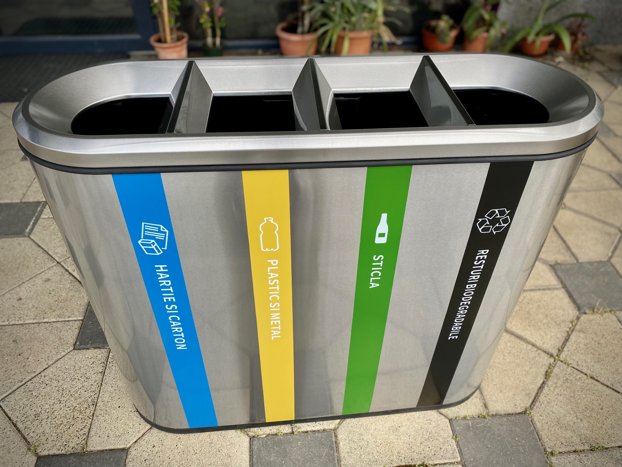 Cu un design elegant și finisaj argintiu, coșul se integrează perfect în birouri, hoteluri, recepții, spa-uri, școli, universități, instituții publice sau centre comerciale, oferind o imagine de profesionalism, curățenie și responsabilitate ecologică. Cele patru compartimente bine definite permit sortarea ușoară și eficientă a materialelor reciclabile, asigurând o gestionare modernă și estetică a deșeurilor.